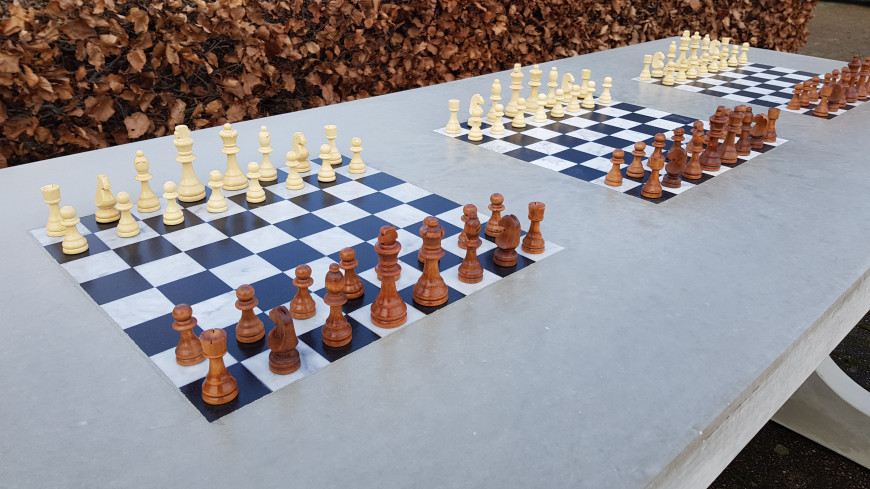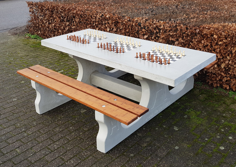 On compte aujourd’hui beaucoup de tables de jeu HeBlad en plein air. Les jeunes et les moins jeunes sont ainsi encouragés à passer plus de temps à l’extérieur. Et, jouer ensemble en plein air favorise aussi le développement des contacts sociaux. Les tables de jeu HeBlad sont disponibles en différents modèles. Celle présentée ici est pourvue de trois échiquiers et peut accueillir six joueurs d’échecs. Cette table d’échecs s’intègre parfaitement dans un espace public tel qu’une aire de jeux, un parc ou le long d’un circuit pédestre. Les tables d’échecs ou de jeu de dames sont également de plus en plus populaires dans les cours d’école.